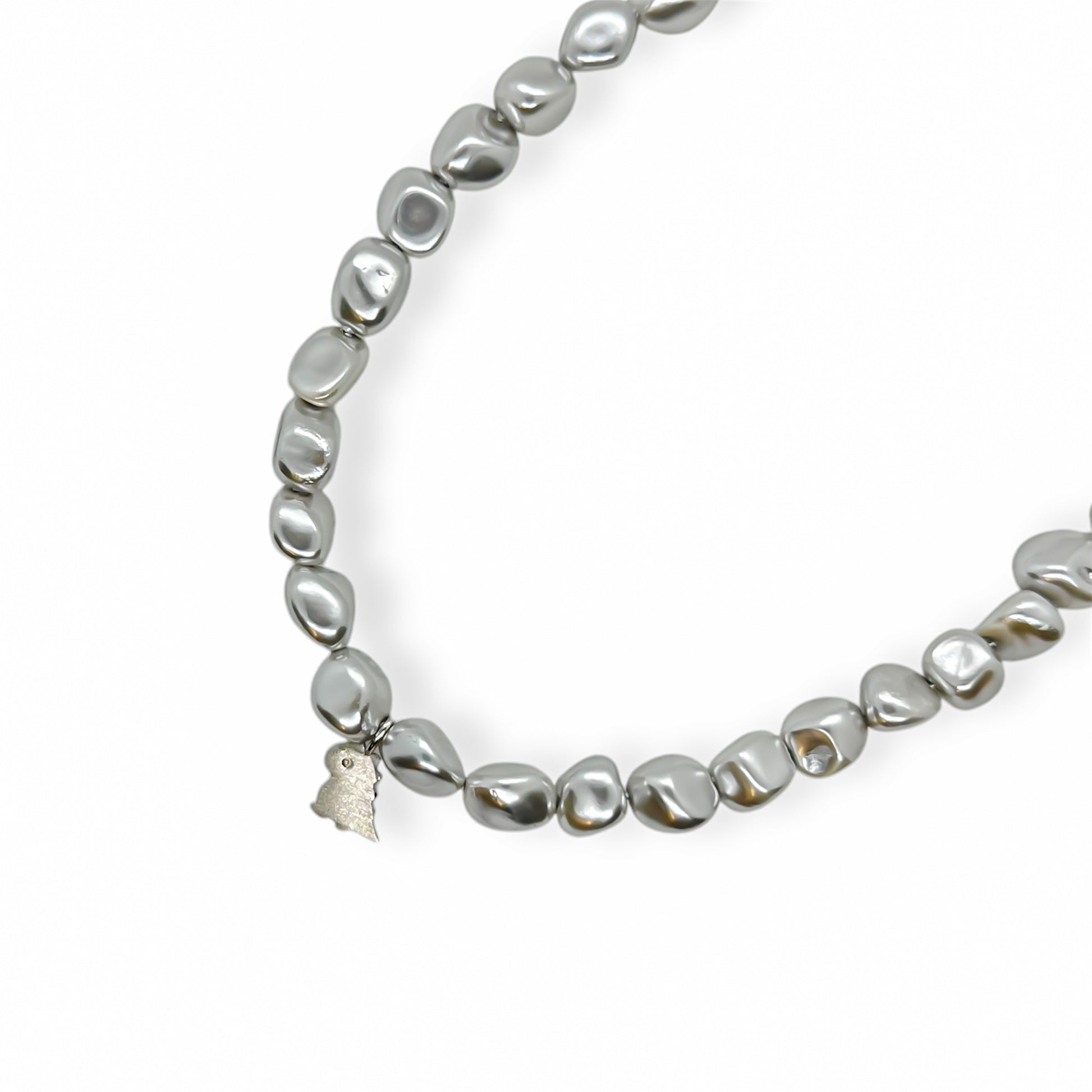 Gemaakt van natuurlijke parelmoer kralen, elk uniek in zijn vorm, aangevuld met een kleine sterling zilveren dinosaurus bedel. Een symbool van kracht en tijdloze schoonheid. De stalen details voegen een moderne touch toe, waardoor het perfect is om te layeren of solo te dragen.
