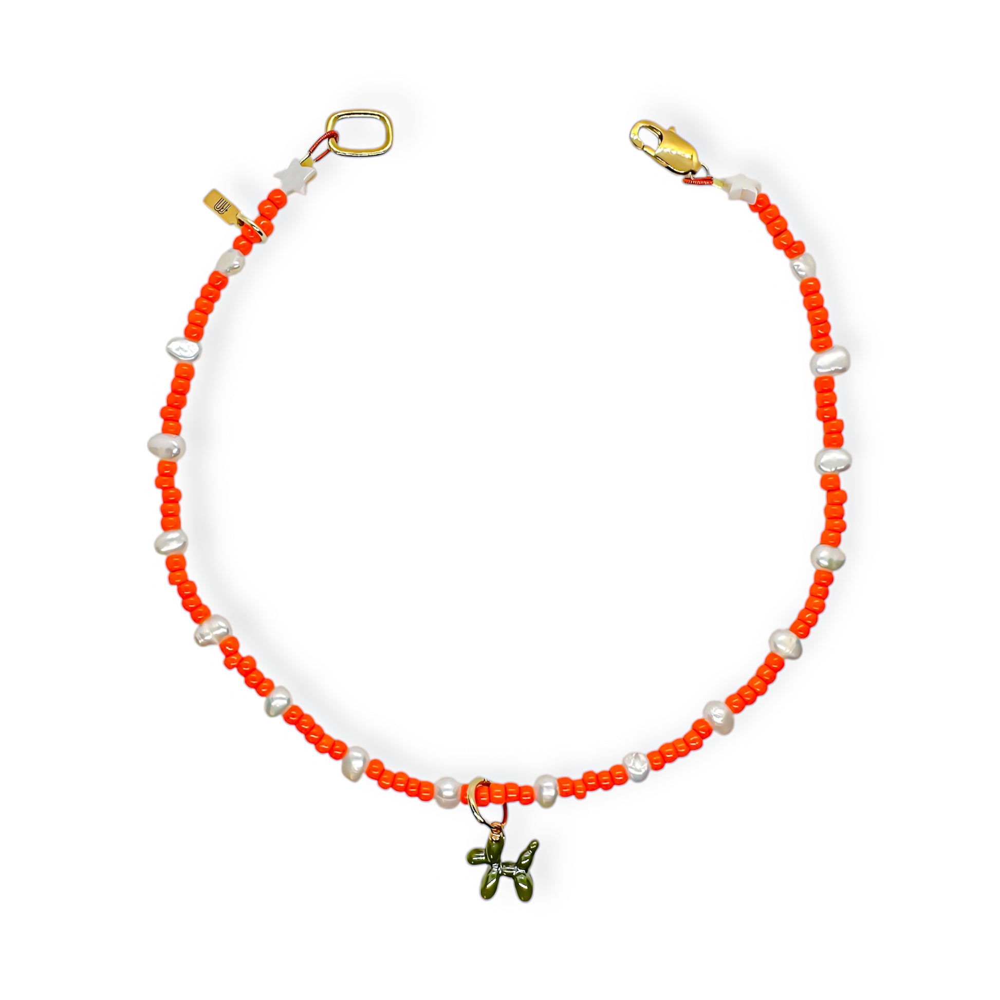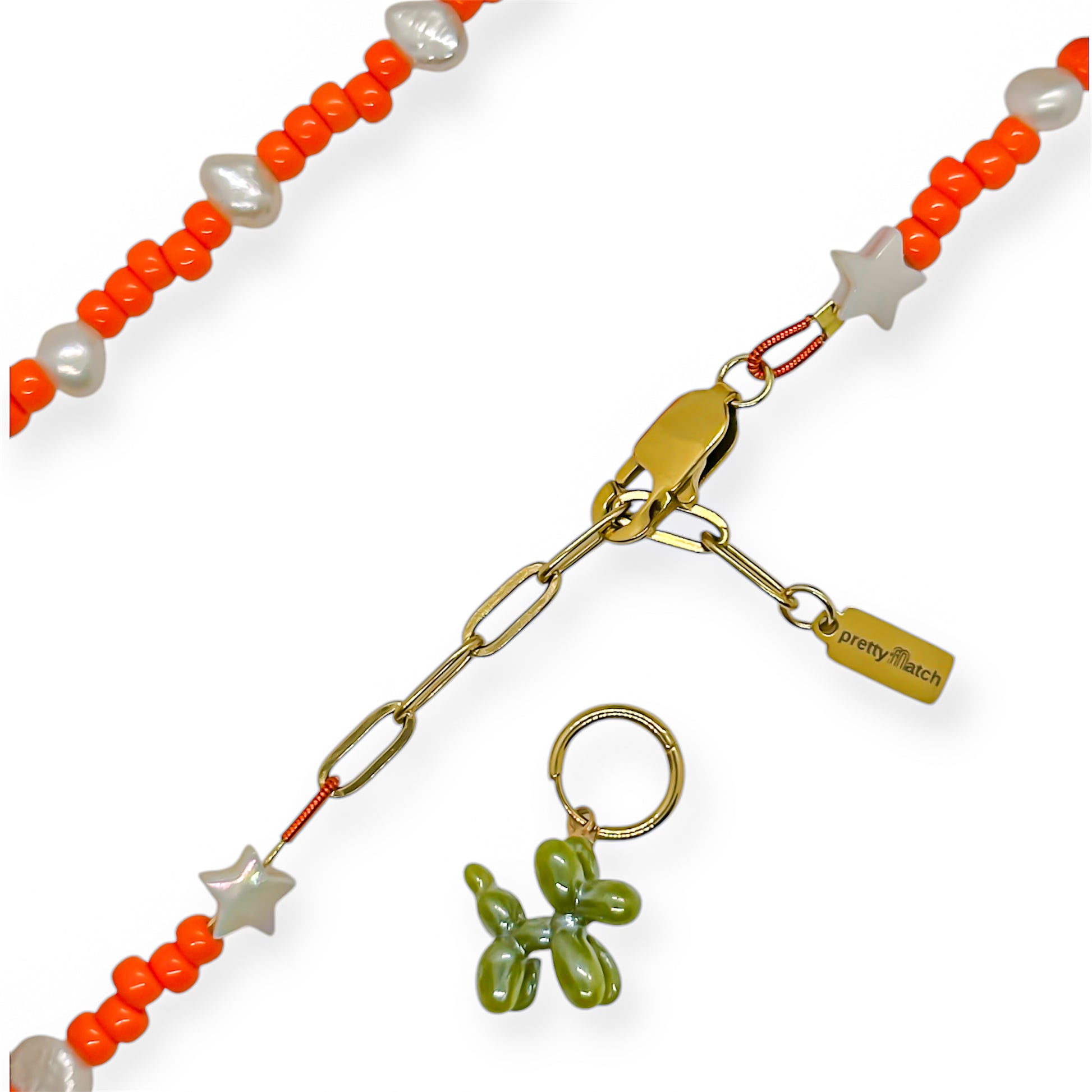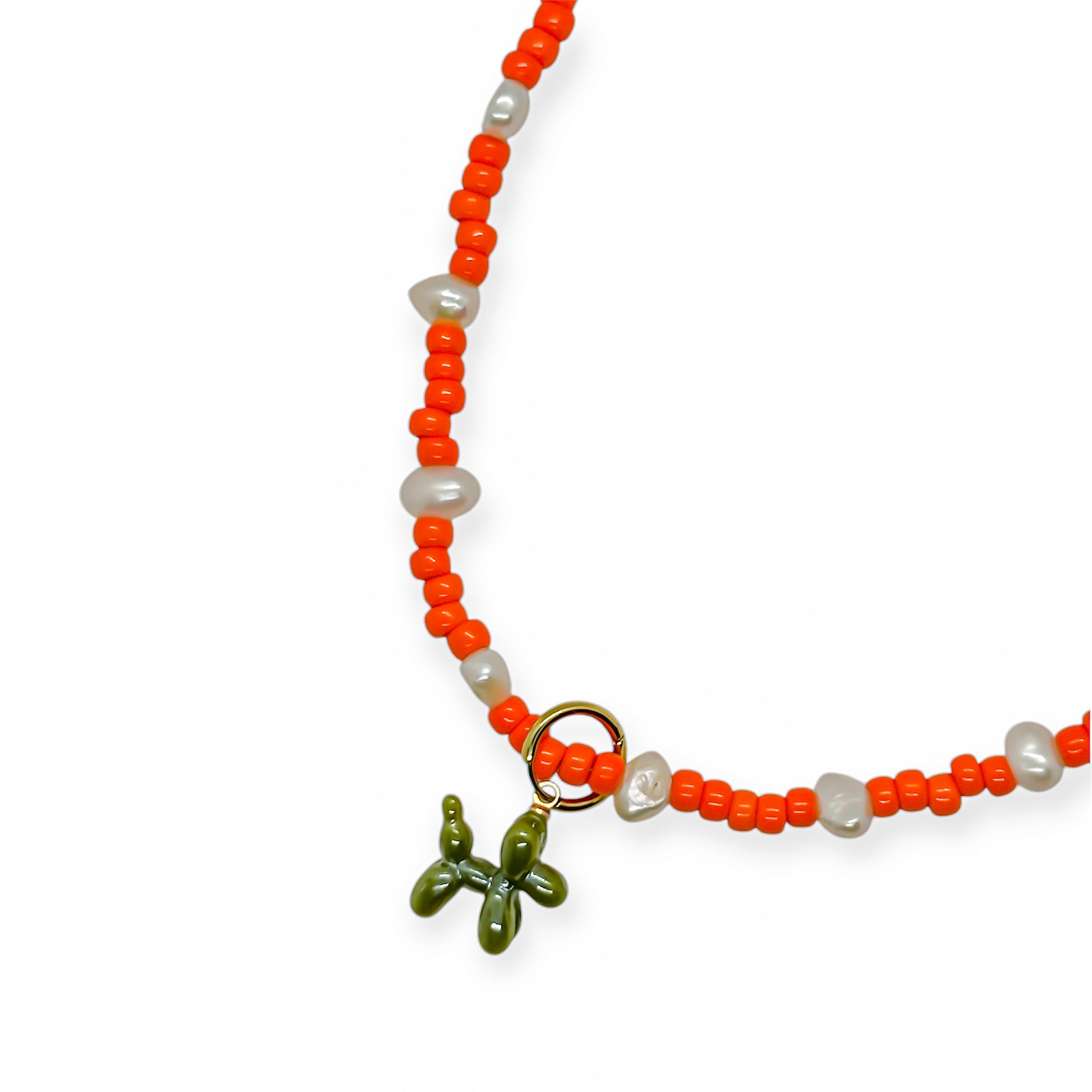 Unleash a playful yet stylish touch to your outfit with the Olive Pup Necklace. Featuring vibrant orange beads and delicate freshwater pearls, this piece is all about energy and fun. The olive-green balloon dog charm adds a quirky, nostalgic vibe, making it a statement piece for any casual or streetwear look.